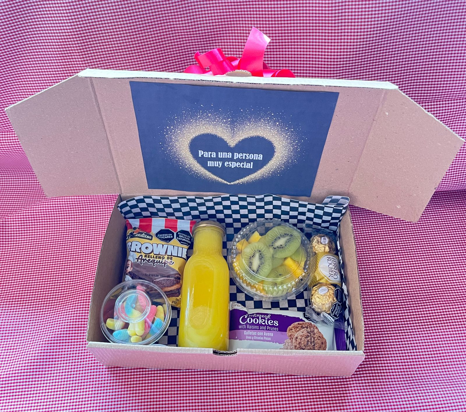 Jugo de naranja, ponque, tarro con gomas, porción de fruta picada, galletas, ferrero por 3 unidades.