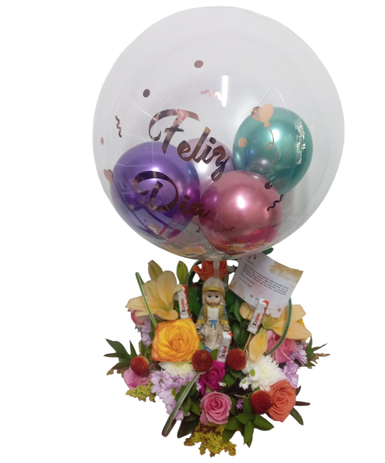 Incluye: hermoso arreglo floral tropical, Virgencita, globo grande decorado, fresas frescas, barras de kinder y tarjeta personaliza.