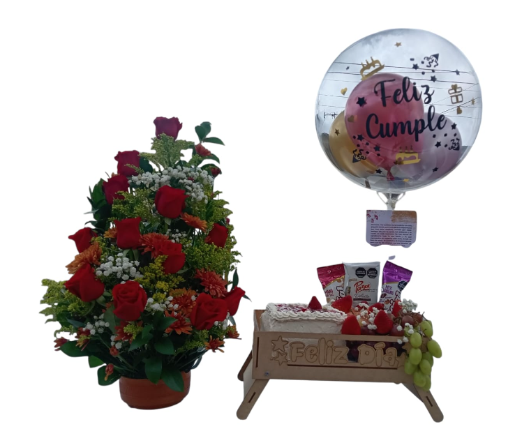 Incluye: bandeja madera, torta de cumpleaños de frutas, 2 maní, 1 piazza, frutas: 1manzana, 1granadilla, 1pera, uvas verdes y rojas, fresas, 1yogurt Alpina, 1chocolates x4u.
