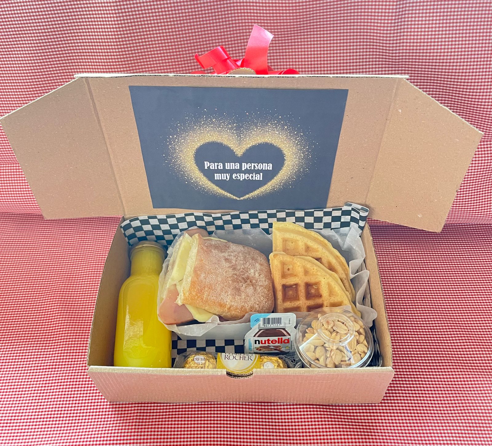 Jugo de naranja, sanduche, waffle, nutella personal, ferrero por 3 unidades, tarro con mani.