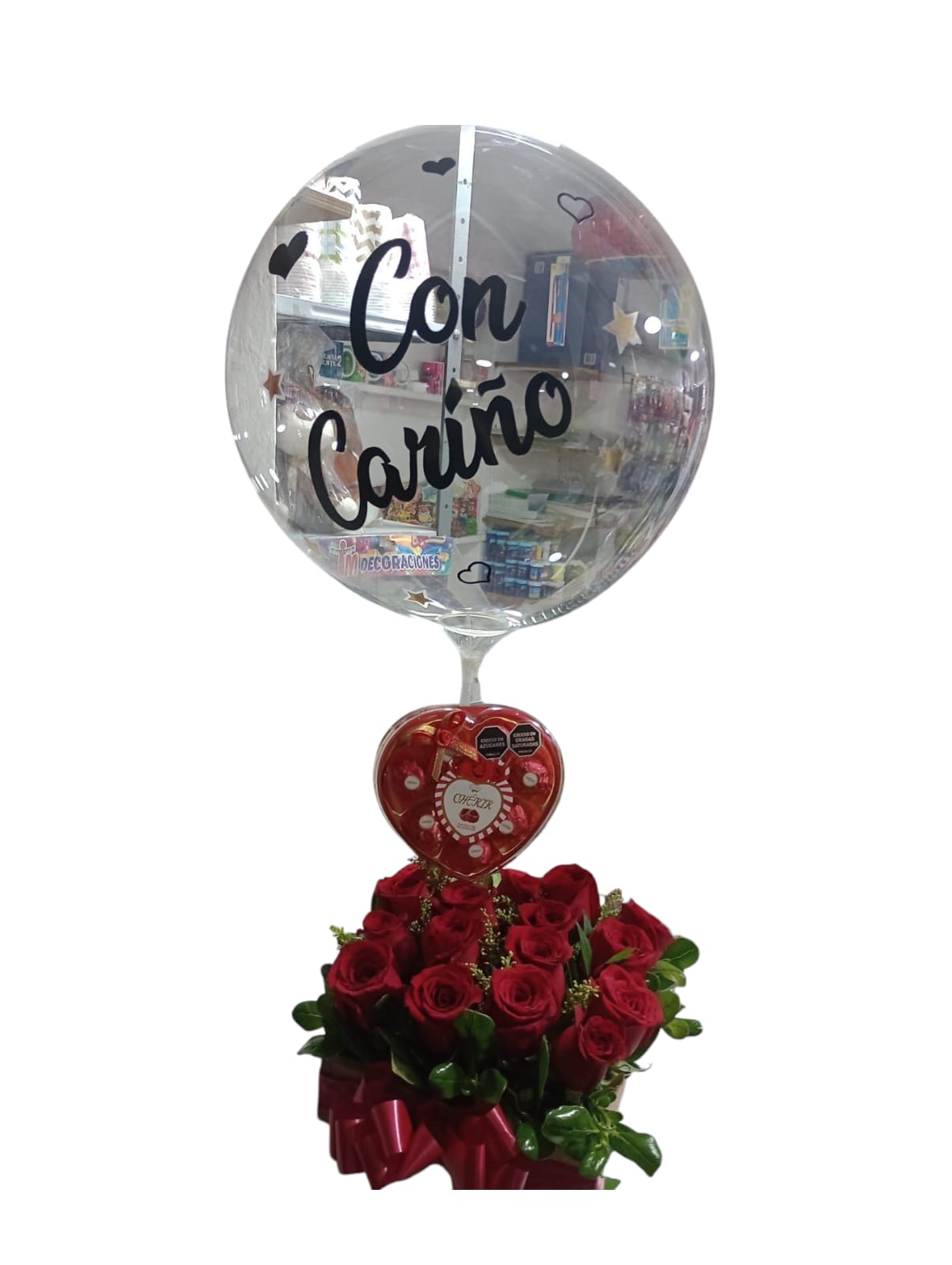 Incluye: Arreglo de rosas cuadrado, con globo grande, chocolates y tarjeta personaliza.