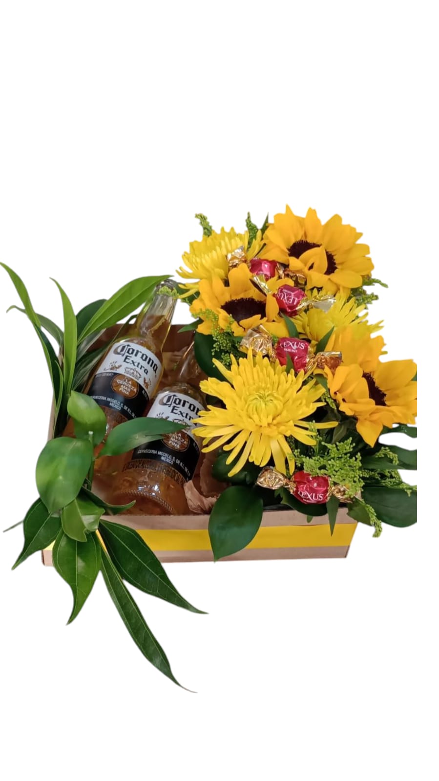 Incluye: Cajita madera con arreglo floral de girasoles y flores amarillas, con chocolates y 2 Coronitas.