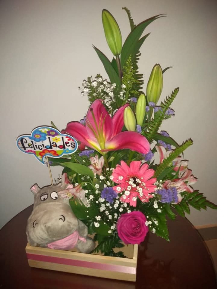 Incluye: Arreglo floral colorido con peluche y tarjeta personaliza en cajita.