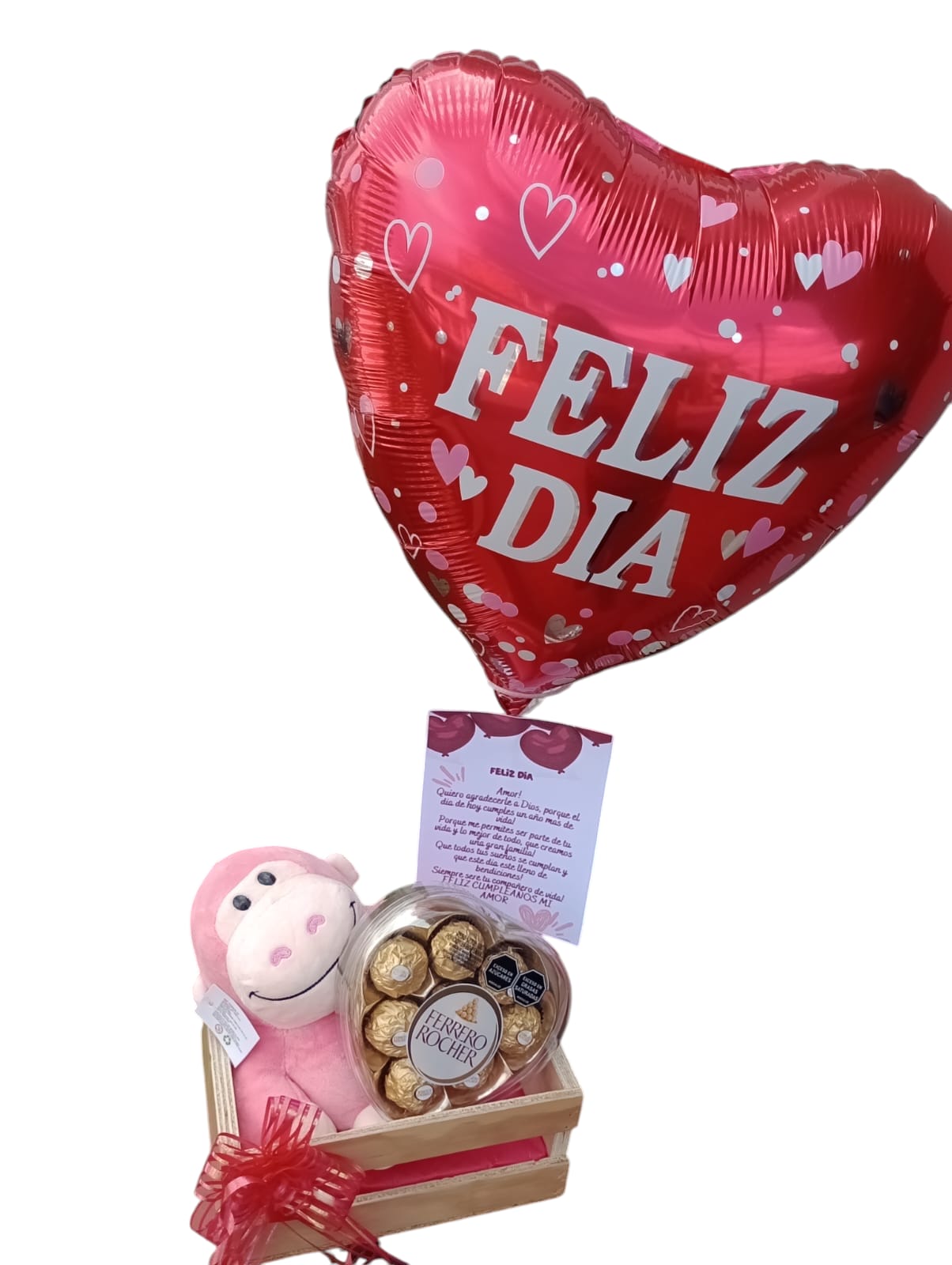 Cajita madera decorada con globo y tarjeta personaliza, peluche y chocolates de corazón.