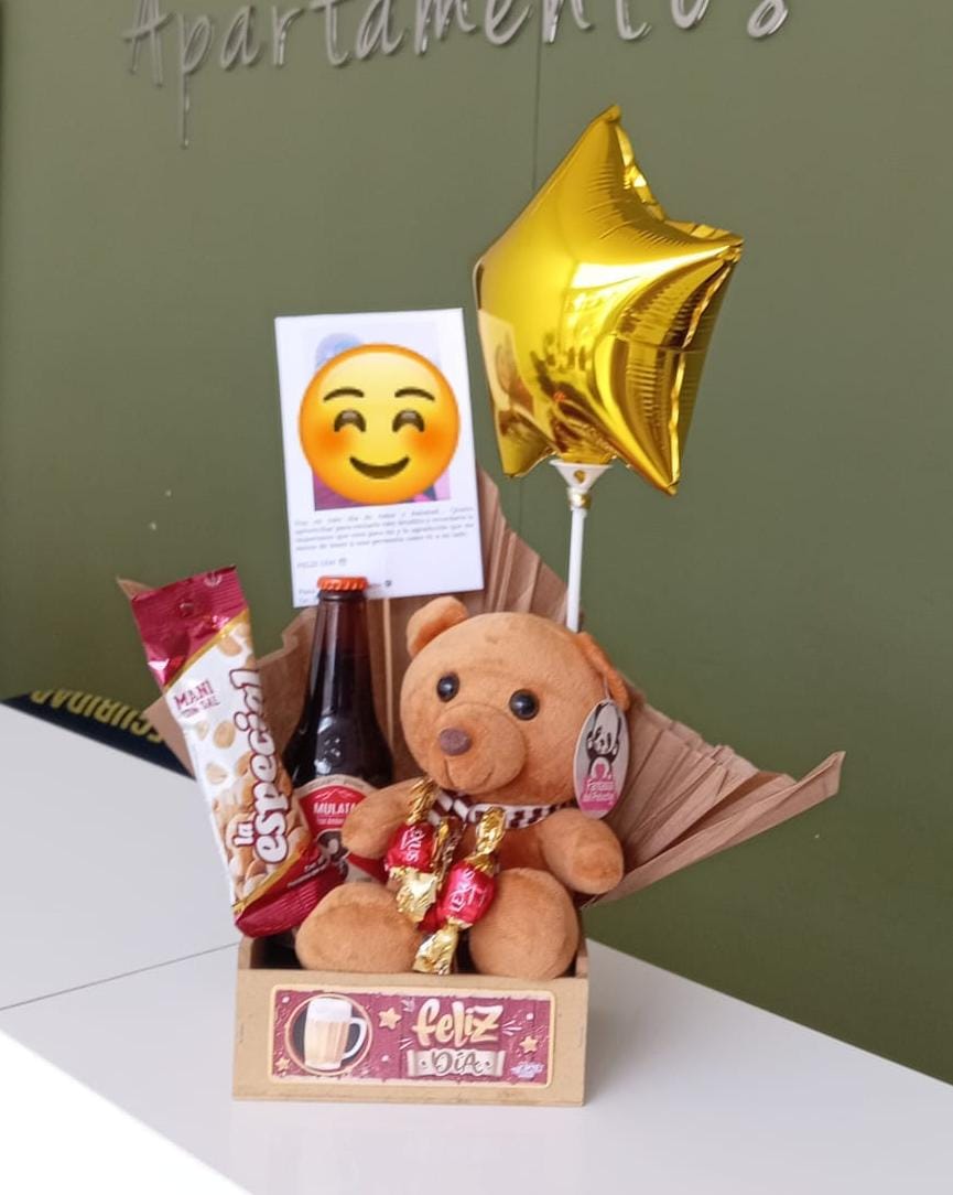 Incluye: Peluche, mani, cerveza y chocolates, en cajita con globo y tarjeta personaliza.